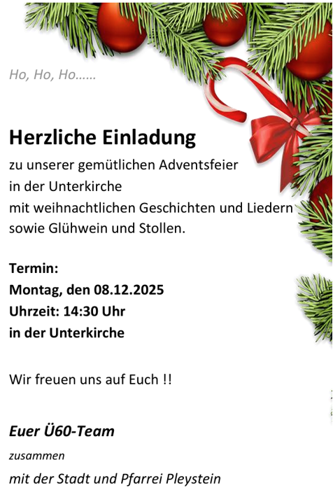 Die Stadt und die Pfarrei Pleystein lädt die 60+ Generation aus der Großgemeinde Pleystein und Seelsorgeeinheit Pleystein-Miesbrunn-Burkhardsrieth zu einer gemütlichen Adventsfeier mit weihnachtlichen Geschichten und Liedern sowie Glühwein und Stollen ein. Gefeiert wird am Montag, den 8. Dezember um 14.30 Uhr in der Unterkirche Pleystein.