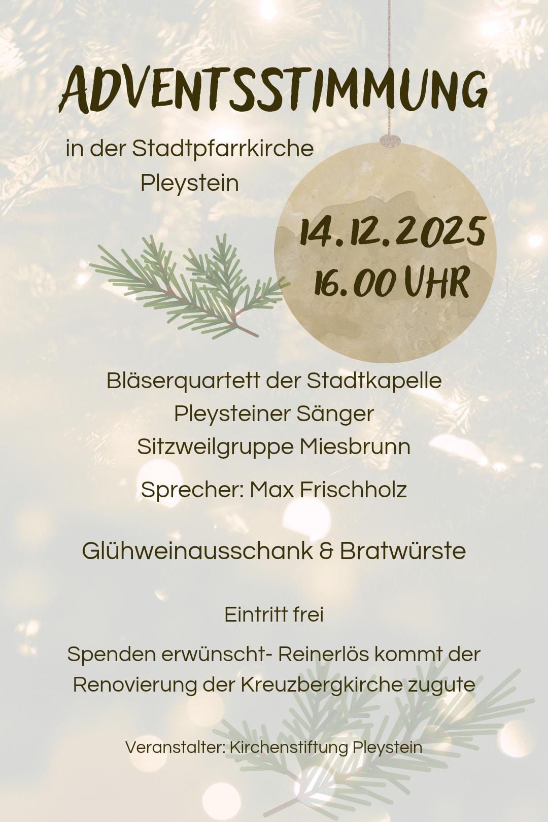 Adventsstimmung am Sonntag, 14. Dezember um 16 Uhr in der Stadtpfarrkirche Pleystein mit Glühweinausschank und Bratwürsten! Musikalisch wird der Nachmittag vom Bläserquartett der Stadtkapelle, den Pleysteiner Sänger und der Sitzweilgruppe Miesbrunn gestaltet. Sprecher ist Max Frischholz. Der Eintritt ist frei. Spenden sind erwünscht. Der Reinerlös kommt der Renovierung der Kreuzbergkirche zugute.