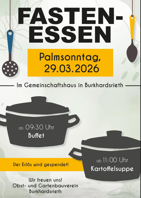 Der Obst- und Gartenbauverein Burkhardsrieth lädt am Palmsonntag ins Gemeinschaftshaus zum Fastenessen ein. Ab 9.30 Uhr gibt es Frühstücksbüffet und ab 11 Uhr Kartoffelsuppe. Der Erlös kommt einem caritativen Zweck zugute.