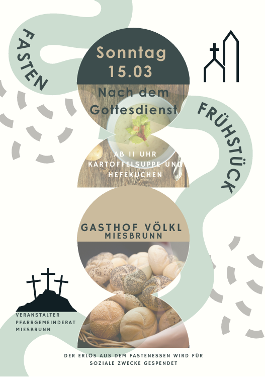 Einladung zum Fastenessen am Sonntag, den 15. März im Gasthof Völkl in Miesbrunn. Nach dem Gottesdienst wird ab 9.30 Uhr Frühstück und ab 11.00 Uhr Kartoffelsuppe mit Brot, sowie Hefekuchen serviert. Der Erlös wird für gemeinnützige Zwecke gespendet. Auf Ihr Kommen freut sich der Pfarrgemeinderat!