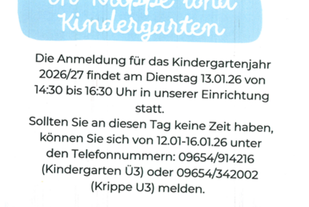 13January Anmeldetag Krippe und Kindergarten Pleystein 14.30 Uhr - Kindergarten St. Elisabeth Pleystein Die Anmeldung für