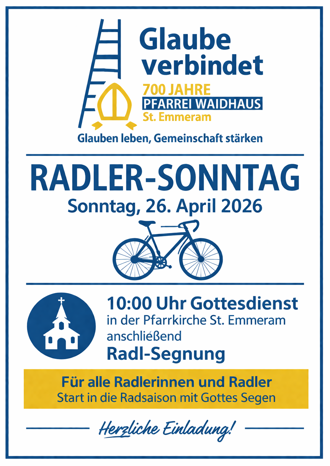 Am Sonntag, den 26. April 2026, sind alle Radlerinnen und Radler herzlich zum Radler-Sonntag eingeladen. Beginn ist um 10.00 Uhr mit einem Gottesdienst in der Pfarrkirche St. Emmeram in Waidhaus. Im Anschluss findet die Radl-Segnung statt – der ideale Start in die neue Radsaison mit Gottes Segen. Herzliche Einladung zur Teilnahme!