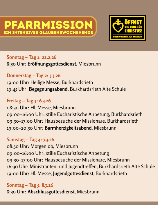 Zur Pfarrmission dürfen wir die Passionisten aus Schwarzenfeld in unseren beiden Pfarreien Burkhardsrieth und Miesbrunn willkommen heißen. Mit Impulsen, Gebetszeiten und Begegnungen möchten sie uns im Glauben stärken und neue Anregungen für den Alltag geben (siehe Programm). Eröffnungsgottesdienst ist am Donnerstag, 5. März 2026 um 19 Uhr in der Pfarrkirche Burkhardsrieth anschließend findet ein Begegnungsabend im alten Schulhaus statt. Herzliche Einladung an alle, diese besondere Zeit bewusst mitzuerleben und mitzugestalten.