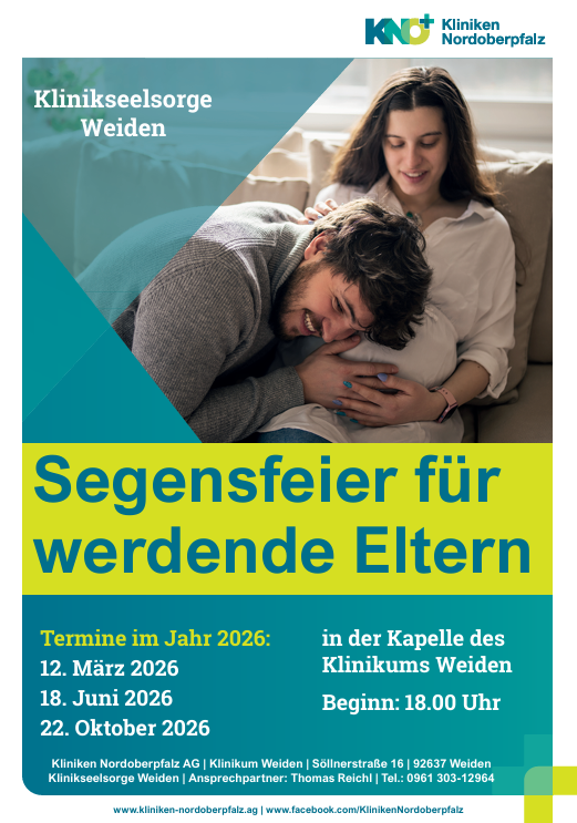 Die Klinikseelsorge am Klinikum Weiden lädt werdende Eltern herzlich zu einer Segensfeier ein. Die Feier findet in der Kapelle des Klinikums statt und möchte Zeit für Besinnung, Stärkung und Gottes Segen schenken. Termine im Jahr 2026 sind der 12. März, 18. Juni und 22. Oktober, jeweils um 18.00 Uhr. Veranstalter ist die Klinikseelsorge der Kliniken Nordoberpfalz AG. Eine Anmeldung ist nicht erforderlich.
